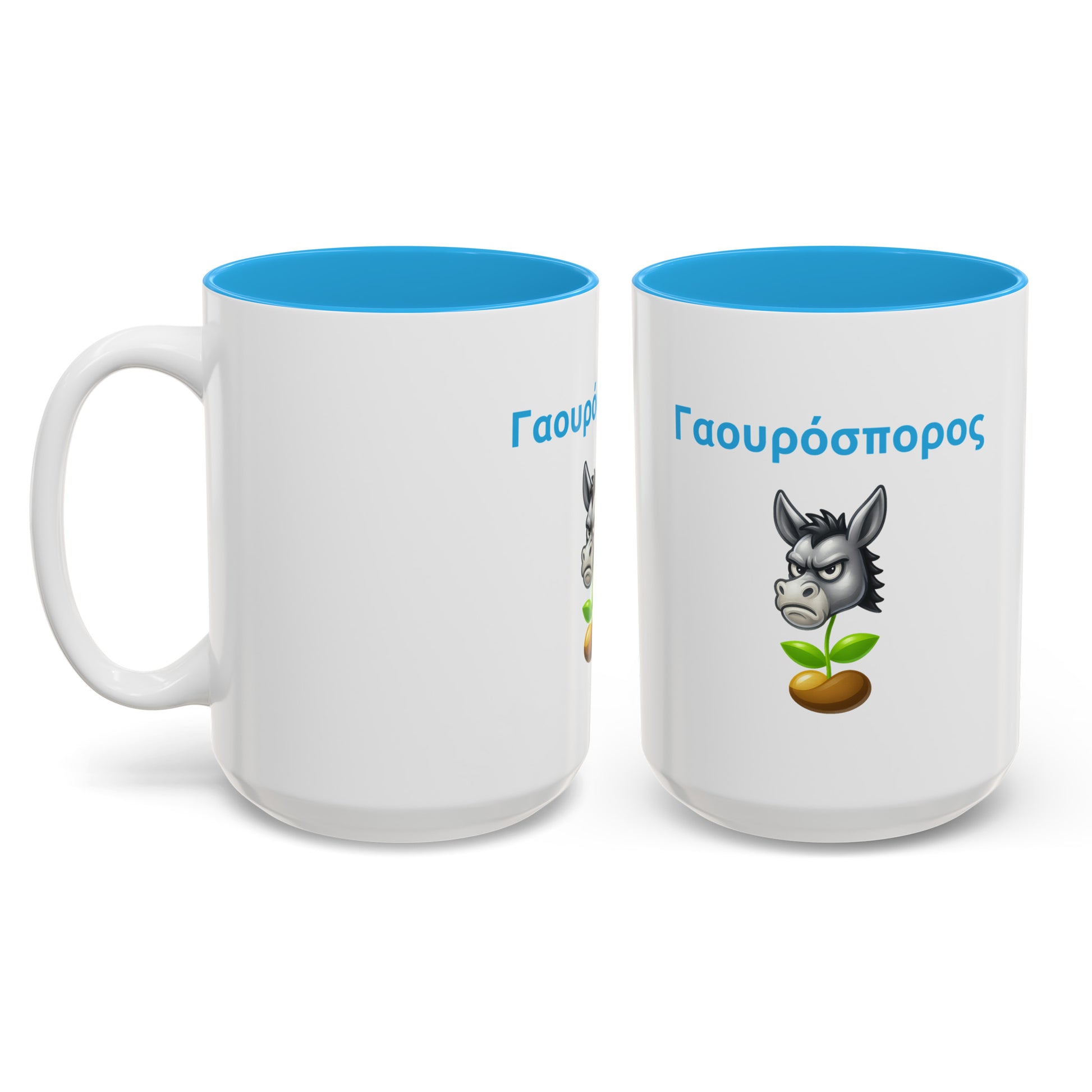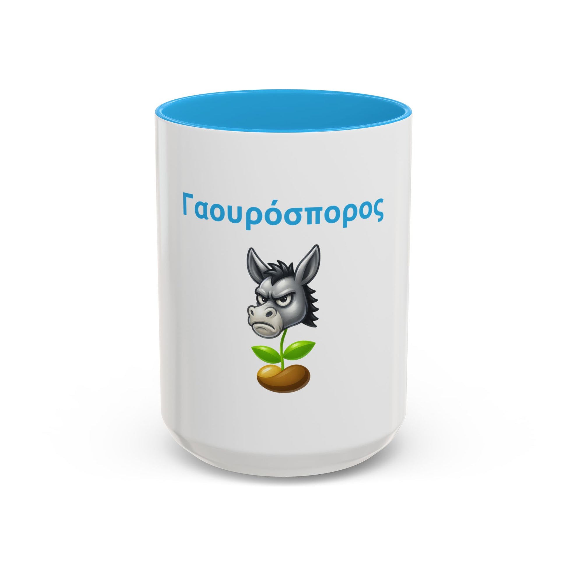 Pure Cypriot humor, freshly brewed. The “Γαουρόσπορος 🫏 🌱” Two-Tone Accent White-Light Blue Mug 15oz celebrates bold souls who own their flaws and laugh about them. A hilarious conversation starter with every cup.