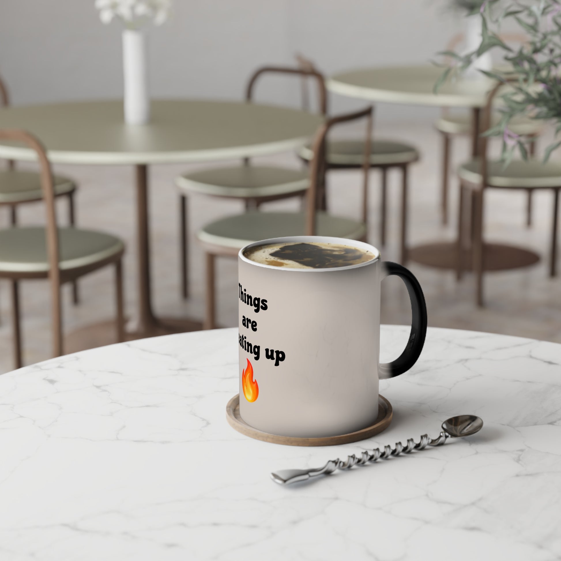 “Things are heating up 🔥” appears with warmth, adding humor and energy to coffee time.